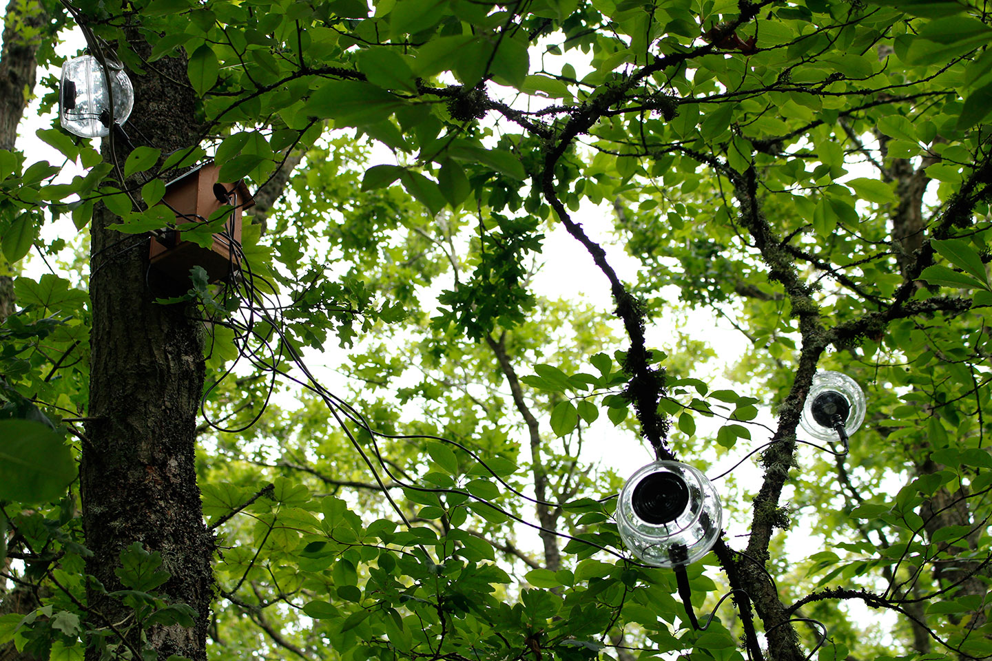 Brainforest is a sound art installation consisting of a multitude of small speakers that are used to subtly integrate artificially created sounds with the natural environment. By altering the sounds of birdsong and mixing them with the characteristics of smartphone notification sounds, a confusing mix between relaxation and stress emerges.